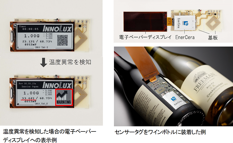 本サービス向けに開発しているセンサータグには、日本ガイシのリチウムイオン二次電池「EnerCera®(エナセラ)」とイノラックスジャパンのFHE技術(※3)を活用した電子ペーパーディスプレイ付きセンサータグを使用しています。温湿度などの異常が検知されると電子ペーパーディスプレイに表示されるため、製品の輸送・保管中の異常の有無が一目で分かるようになっています。また、使い捨ての一次電池を使用したタグと違い充電が可能なため、繰り返し使うことができます。薄型で曲げ耐性があるため、湾曲した面や限られたスペースにも装着が可能です。2022年1月の実証試験では、130時間継続してワインセラー内の保管温湿度のデータの取得に成功しており、イタリアから日本へのおよそ60日間のワイン輸送中の温湿度をモニタリングする実証試験も実施する予定です。