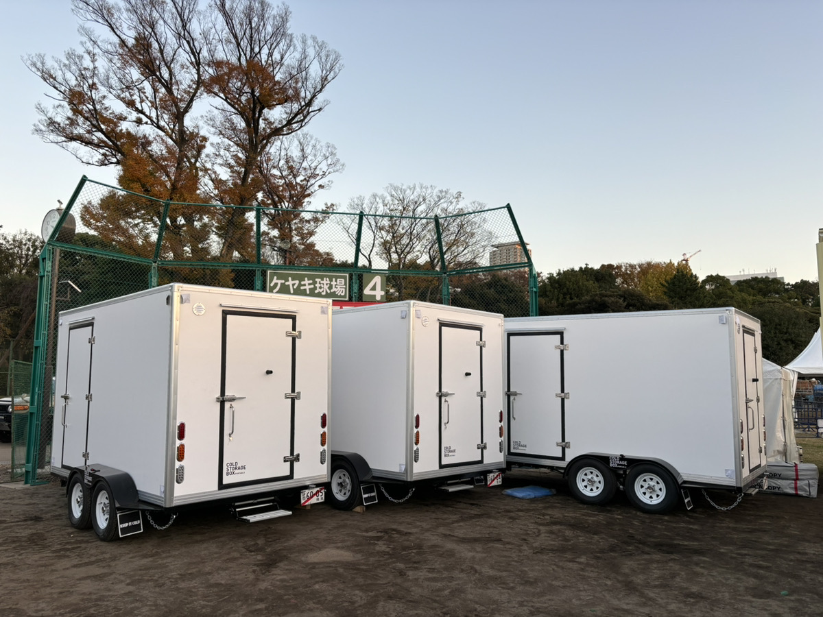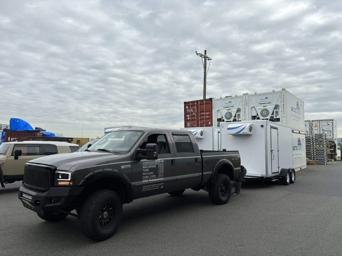 移動に牽引免許が必要ですが、大容量(約15,000リットル)冷蔵、冷凍保管可能な移動可能コールドストレージが日本初上陸です。